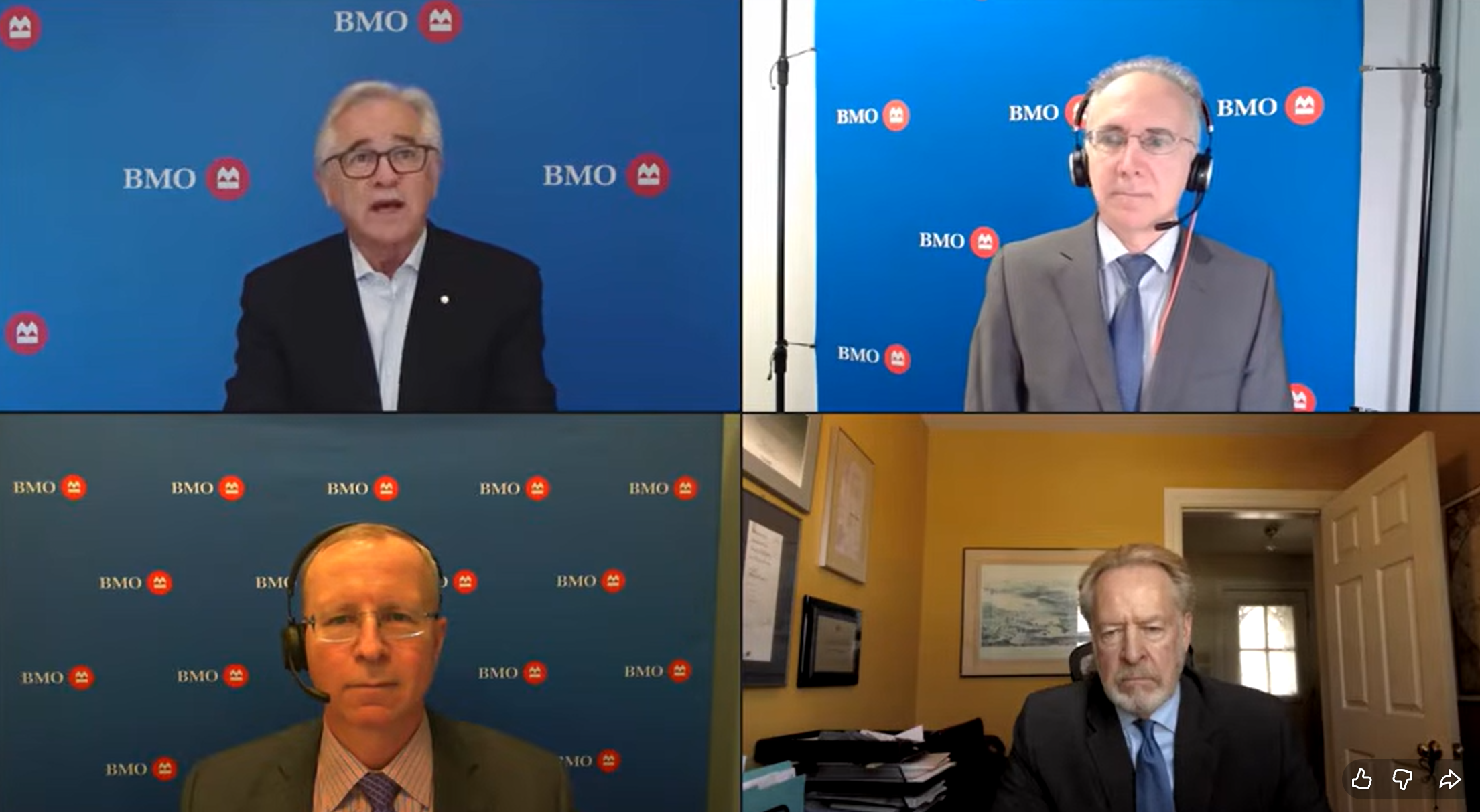Brian Tobin, Vice Chair, BMO Financial Group, moderated an online event featuring Sal Guatieri, Director and Senior Economist at BMO; François Trahan, Chief Investment Strategist for BMO Capital Markets and Steve Verheul, Canada’s former chief trade negotiator on the global trade outlook. ‘The compliance exemption for Canada is everything,’ says Guatieri. / SCREENSHOT